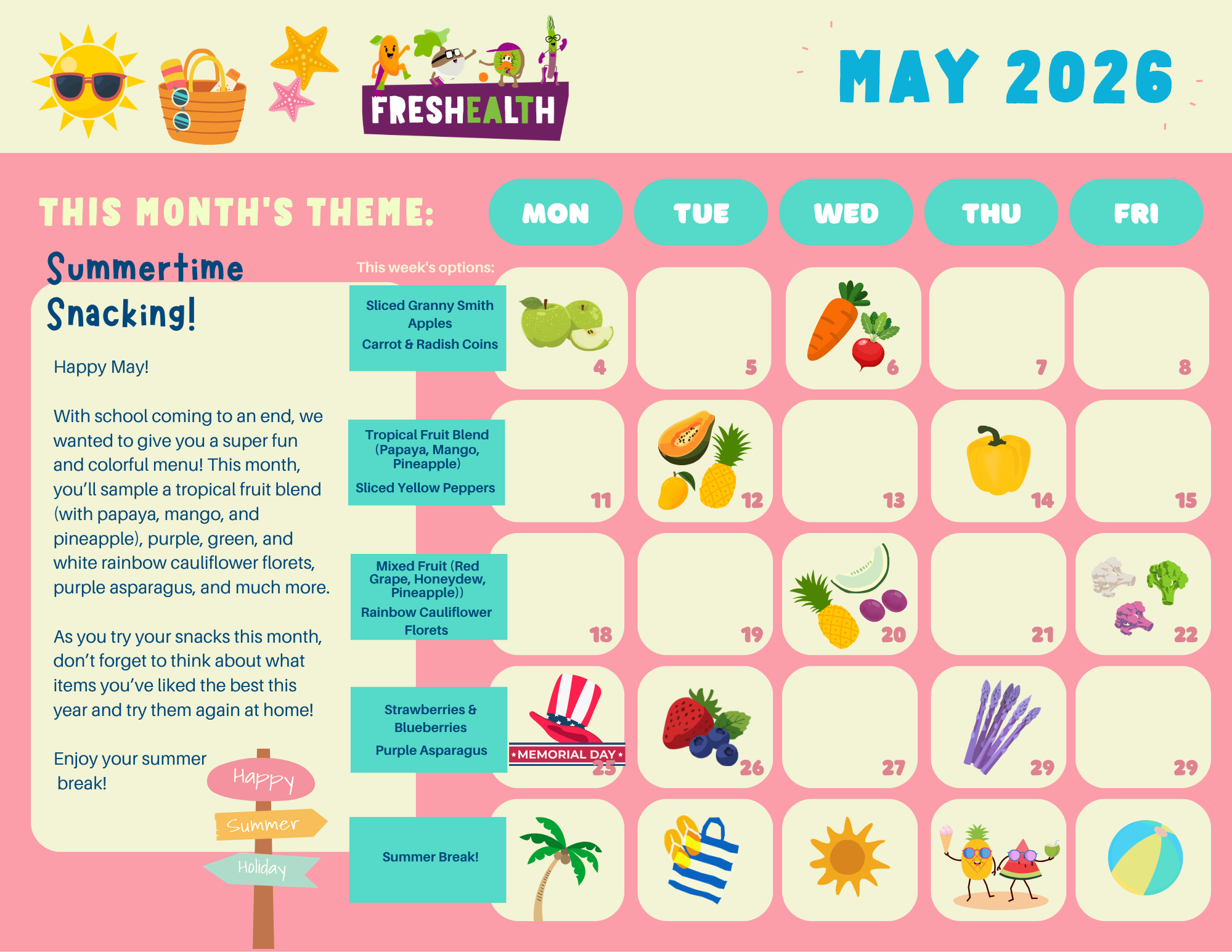 Please note that we made a small update to this month’s FFVP calendar: Oroblanco wedges have been replaced with pineapple chunks due to sizing constraints impacting production.